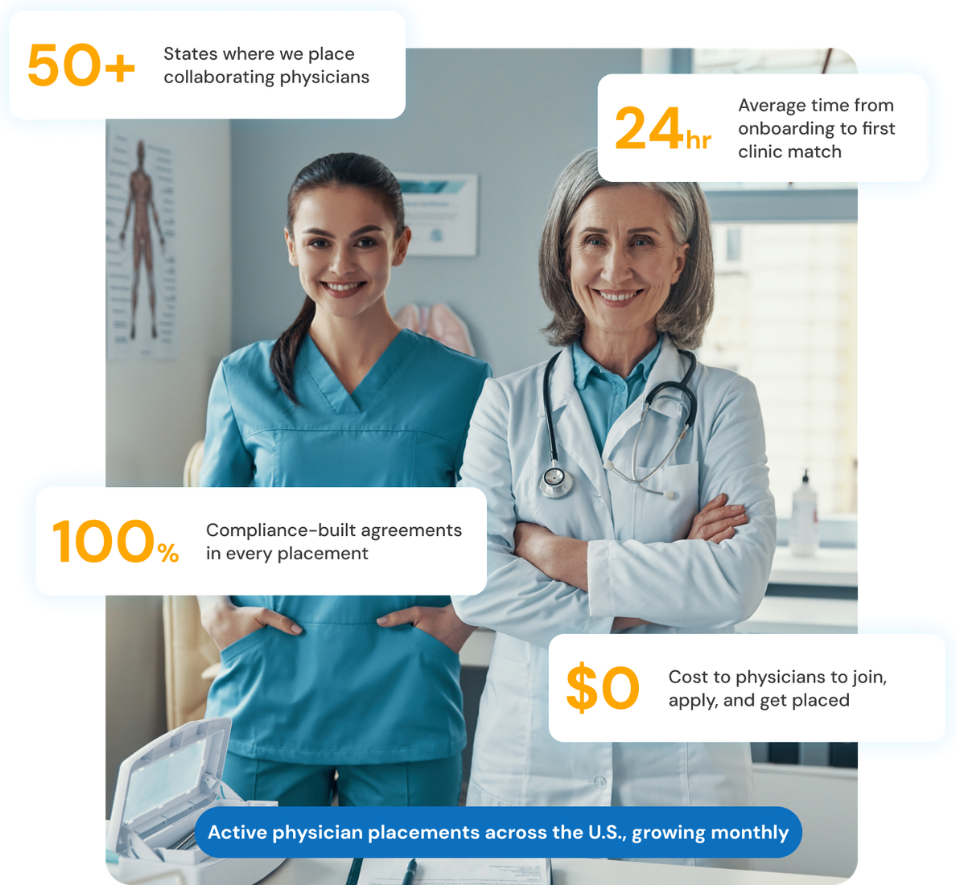 Thousands of clinic owners across the U.S. need qualified collaborating physicians right now. Thousands of physicians want remote income without running a clinic. We bridge both sides with a structured, compliant, and fully supported placement process.